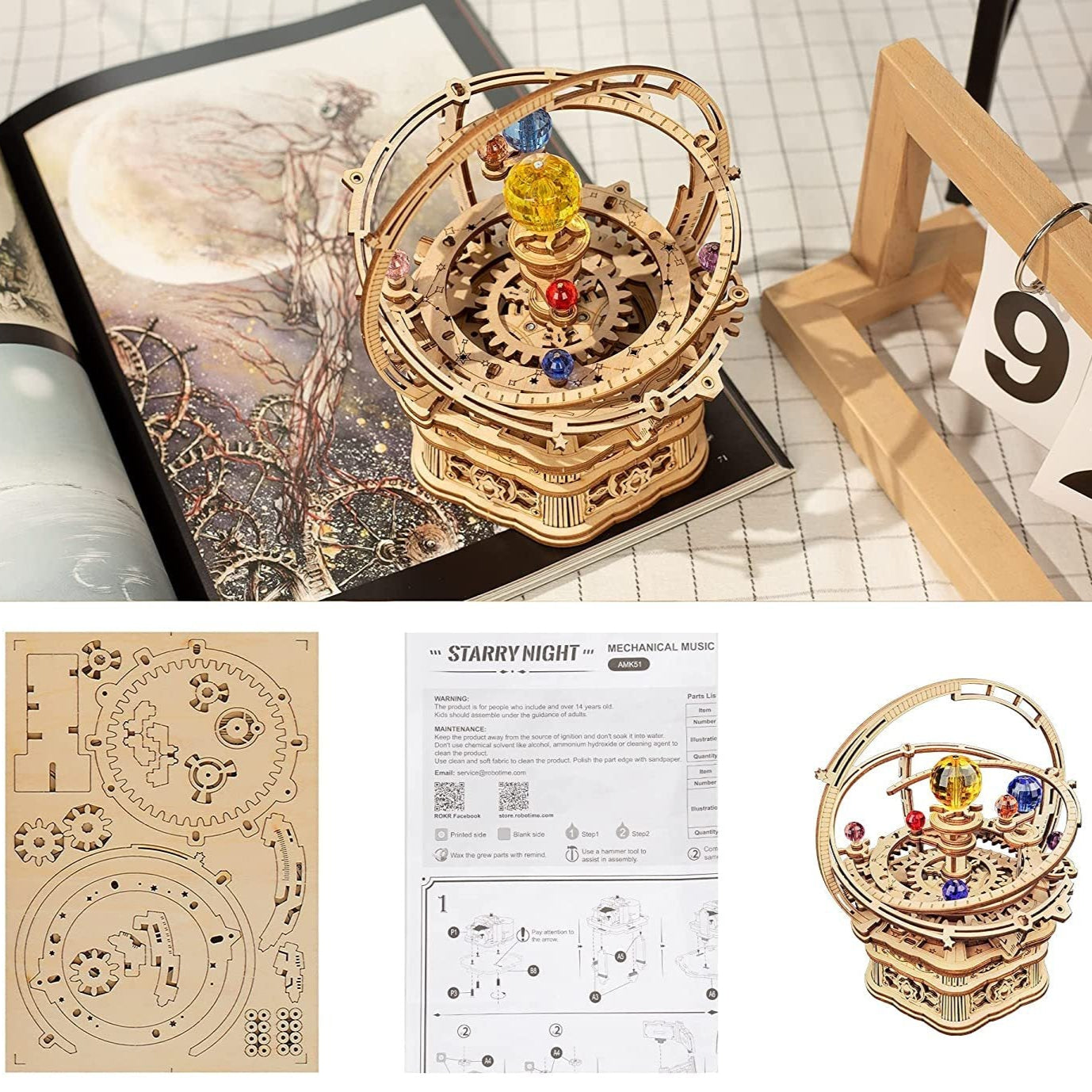 📦 Contenu : Pièces en bois prédécoupées, mécanisme musical, instructions en anglais (colle et cire non incluses)